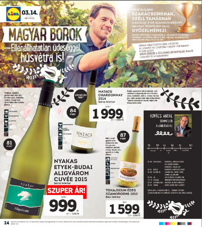 Kiedy w Polsce wielu blogerów zadaje sobie pytanie, jaki zestaw trunków z krainy Madziarów pojawi się na półkach, węgierski Lidl przystąpił do działania i pokazał swoją gazetkę. Jest tam kilka ciekawych butelek, a całość mieści się w przedziale cenowym od 599 do 1999 HUF (od 8,5 do 28 PLN). Nie ma w nim żadnych aszú, ani wielkich win z Villány, ale przeciętny zjadacz chleba powinien znaleźć coś dla siebie.