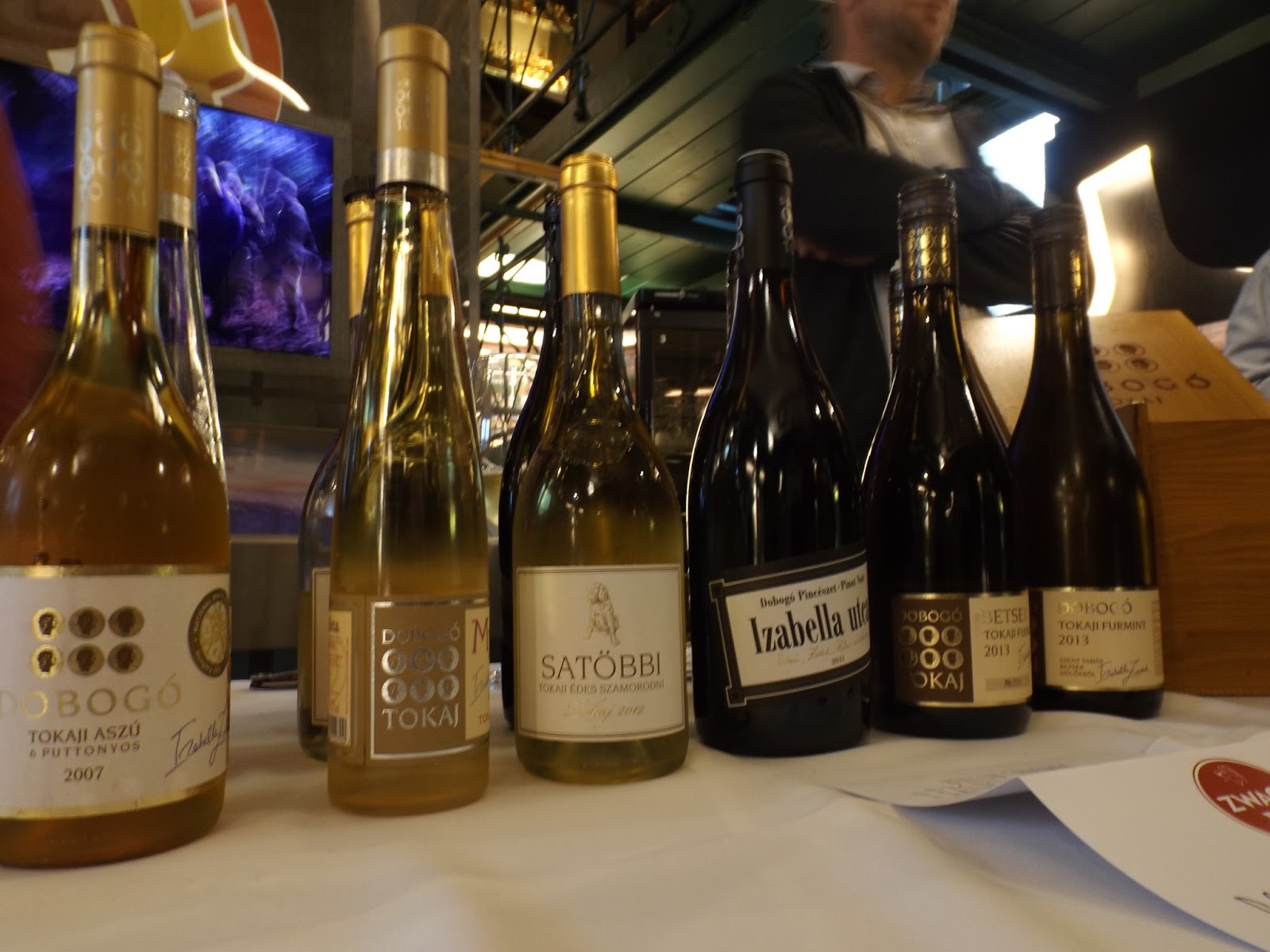 Kolejnym producentem, u którego zawitałem było Dobogó Pincészet z Tokaju. Winnica założona przez gospodynię wieczoru, Izabellę Zwack w 1995 roku. Skosztowałem 8 win, w tym kuriozum – czerwonych win sprzedawanych pod etykietą Izabella utca. Degustacje zacząłem od Birtok Furmint 2013 – barwa jasnozłota, w nosie wyczujemy nuty beczki, wanilię, śliwkę, miód. W ustach wyraźnie wyczuwalne aromaty jabłoni, wanilia, gruszka, niesamowicie złożone, niezła mineralność, gdzieś w tle mruga nam suszona śliwka. Dla mnie rewelacja. Ocena: ****. Cena: 2989 HUF (41 PLN). Następnym degustowanym winem był Betsek Furmint 2013, czyli ten sam szczep, tylko z jednej parceli. Tu mamy jasną, niemalże słomkową barwę, nos zielony – trawa, kwiaty polne, w ustach nuty zielonego jabłka, niesamowita świeżość, lekko wyczuwalne nuty mięty, przyprawy. Ocena: ***. Cena: 4632 HUF (63 PLN, ale to cena za rocznik 2012, więc może się troche różnić). Słabszy od poprzednika. Następnie nadeszła pora na kuriozum, czyli Izabella Utca 2012, które jest winem czerwonym, składającym się w 100% z Pinot Noir z parceli Urágya w Mád. Jasnoczerwona barwa, nos wiśniowy, w ustach wyczuwalna łagodna, krągła kwasowość, delikatne taniny, nuty wiśni oraz owoców leśnych. Jest to rewolucjonista, ale ja jestem na tak dla takich rewolucji. Ocena: ***. Cena: brak (jeszcze nie dostępne na rynku). Nieco później pojawiła się także Izabella Utca 2011, o podobnej, jasnoczerwonej barwie, nos owocowy, w ustach nuty maliny, czereśni, owoców leśnych. Dobra struktura. Wydaje mi się jednak, że jego następca jest nieco lepszy. Ocena: ***. Cena: 4782 HUF (65,50 PLN). Jednak jak już jesteśmy przy winach z Tokaju, to należy przejść do tego, z czego jest najbardziej znany, czyli win słodkich.