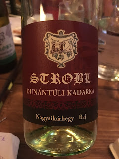 Stróbl Olaszrizling 2015 – mamy tu bladożółtą barwę, w nosie nuty trawy, zielonych owoców, cytrusów oraz zielonego jabłka. W ustach świeże, z całkiem przyjemną kwasowością, którą umiejętnie równoważy cukier resztkowy. Trochę cytrusów, trochę nut zielonych owoców, choć brakuje tu szlachetności. Ogólnie całkiem przyjemne wino do codziennej degustacji. Ocena: **/***. Kolejne wino, Stróbl Sauvignon Blanc 2015 musieliśmy wyrzucić ze względu na uszkodzoną nakrętkę. Oceny tego co znalazło się w butelcę się nie podejmuję.