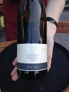 Pierwszym wybranym przeze mnie winem był Steinmühle Osthofener Riesling 2014 Qba. Jasnozłota barwa, w nosie wyraźna mineralność, cytrusy, trochę nut pikantnych oraz petrol. W ustach wyraźnie mineralne, jakby nieco słone, wyraźna, lecz nienachalna kwasowość, cytrusy, w tle nuty pigwy. Pikantny finisz. Nieco surowe, ale przyjemne. Ocena: ****. Następnie podano mi BattenfeldSpanier Riesling Trocken 2014, podstawowe wino tej winnicy. Posiada jasnozłotą barwę, w nosie wyczuwalne cytrusy, mineralność, brzoskwinie, nieco nut miodowych oraz petrol. W ustach bomba owoców egzotycznych, grapefruita, cytrusów, delikatna słodycz (z ekstraktu?), wyraźna mineralność. Finisz z nutami zielonego jabłka. Świeże, lekkie, dobre. Ocena: ****/*****. Następnie przyszła kolej na wino z jednego stanowiska – BattenfeldSpanier Riesling Eisbach Trocken 2014. Tu również mamy jasnozłotą barwę, w nosie wyraźnie mineralne, mamy tu nuty soli morskiej oraz cytrusów. W ustach krągłe, z nieco bardziej solidną strukturą, oprócz tego wyczuwalne są nuty owoców egzotycznych, mineralność, petrol, zielone jabłko oraz pigwa. Długi finisz. Solidne, choć poprzednik bardziej mi odpowiadał. Ocena: ****.