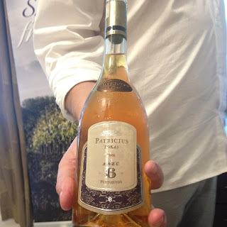 Kolejnym podanym winem było Oremus Tokaji 5 puttonyos Aszú 2000. To już zdecydowanie bardziej dojrzałe wino, co zdradzała bursztynowa barwa, ale także złożony nos, w którym oprócz dominujących nut miodu, botrytisu pojawiły się również nuty suszonych owoców. W ustach krągłe, oleiste, wyraźnie wyczuwalne akcenty miodowe, nuty cytrusów. Doskonale zbalansowana słodycz i kwasowość. Piękne. Ocena: ****/*****. Ciekawym winem wydało się również Gizella Pince 6 puttonyos Aszú 2008. Było to pierwsze z serii sześcioputtonowych win, czyli najwyższa kategoria tokajów (nie licząc esencji, ale ta technicznie nie jest winem…). Jak u poprzednika mamy tu bursztynową barwę, w nosie mamy brzoskwinię, suszone owoce, miód, wanilię oraz botrytis. W ustach na pierwszy plan wysuwa się piękna kwasowość, przez co wino sprawia wrażenie lekkiego, mimo poteżnego cukru. Dalej pojawiają się nuty brzoskwinii, moreli, a wszystko wieńczy długi, wspaniały finisz. Ocena: ****. Następnie nadeszła kolej na Zsirai 6 puttonyos Tokaji Aszú 2008. Bursztynowa barwa, w nosie brzoskwinia, suszona śliwka, botrytis. W ustach potężna słodycz, którą nieco tylko balansuje kwasowość, sporo nut owocowych, oleiste, miodowe. Ciut słabsze od poprzednika, ale i tak zasługuje na pochwałę. Ocena: ****.